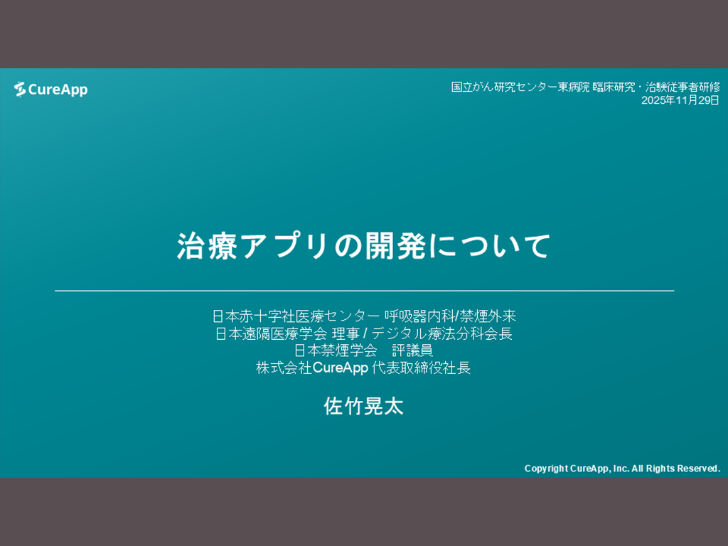 治療アプリは、医師が処方し、患者が利用するソフトウェアの医療機器であり、従来十分に医療介入できていなかった患者の行動や考え方にアプリで介入し治療します。本講義では、治療アプリの開発をされているCureApp社社長であり医師の佐竹先生を招き、治療アプリの開発や薬事承認、保険償還について解説して頂きました。