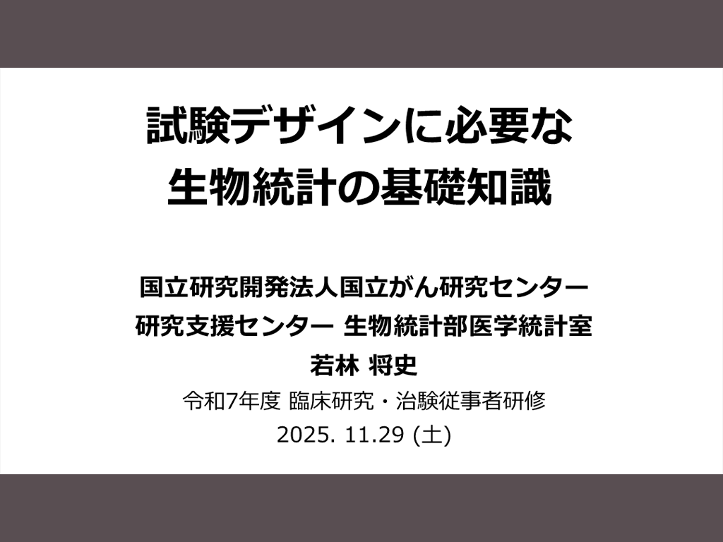 この講座は、厚生労働省 臨床研究総合促進事業の一環として、臨床研究を実施する医師・歯科医師等を対象に、質の高い研究計画書を作成し、確実に実行できる研究者を育成するための研修として2025年11月29日に国立がん研究センター東病院で実施されたものです。