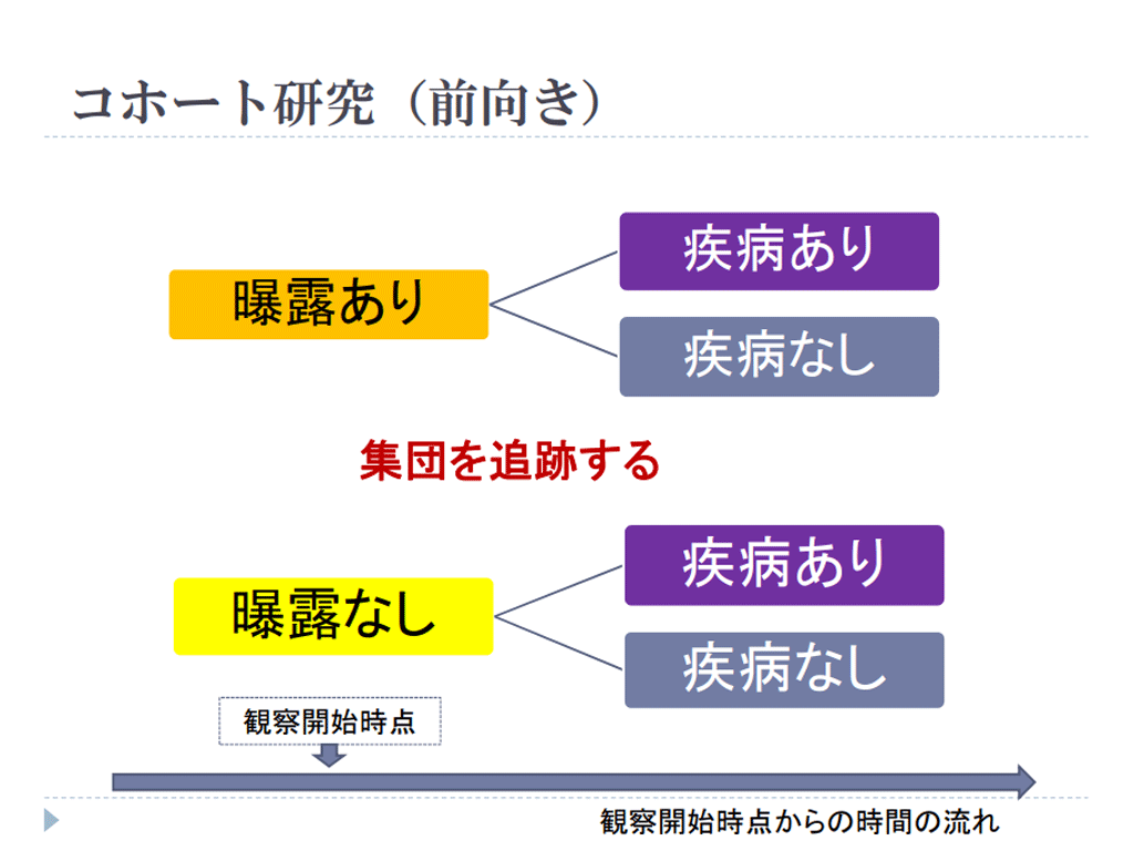 コホート研究は、エビデンスレベルが高く、希少疾患には適用が困難な研究デザインです。曝露と疾病発生の時間的関係を明らかにできるので罹患率や死亡率の算出と仮説の検証が可能であること、追跡の際に脱落を減らすことが重要であることについて学びます。