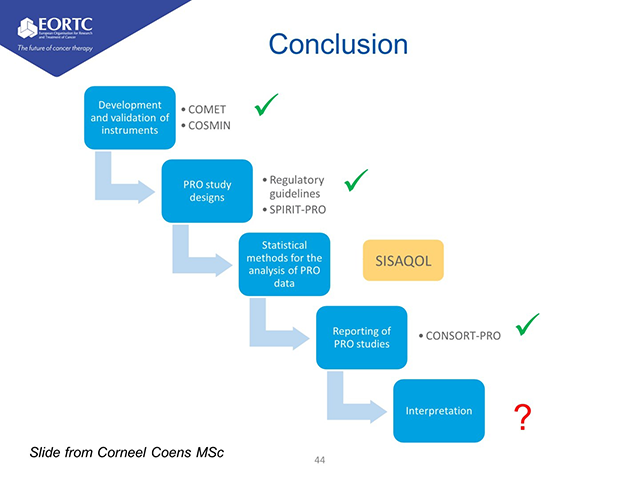 EORTCのQoLグループの統計家であるMadeline PE先生に、ランダム化試験でのPRO/QoLデータの解析手法の考え方や、アカデミア、規制当局を中心に進められている解析手法の標準化に関する活動(SISAQOL)についても解説して頂きました。