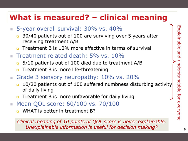 ワークショップで唯一、がん臨床試験におけるPRO/QoL評価に反対の立場として、評価における問題点などを解説して頂きました。