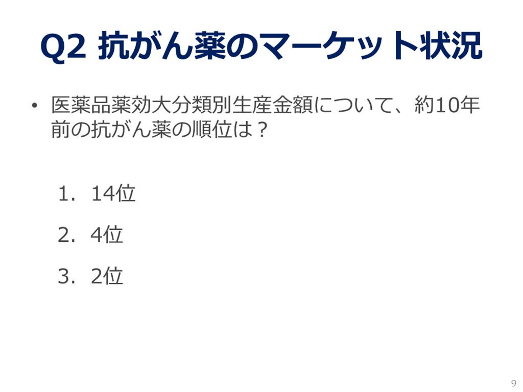 抗がん剤市場の変化や臨床研究法の施行により、医師主導臨床試験の役割も変わりつつあります。臨床試験は企業だけがやっているわけではありません。「製薬企業が関わらない分野の治療開発って何?」と疑問に思った方は是非ともご覧ください。 途中にクイズを出していますので、その時間は動画を止めて、ご自身で回答してみてください。なお、セミナー時に表示されていたzoom上の参加者のクイズに対する解答画面は表示されません。