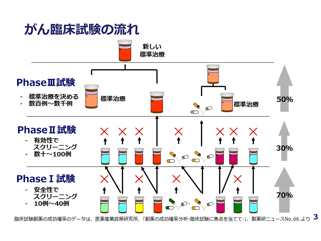 臨床試験は標準治療の確立に不可欠です。臨床試験による治療開発は有効な治療法をスクリーニングする目的でphase I、phase II、phase IIIの順に段階的に行われ、各phaseではそれぞれ目的が異なります。ここでは、がんを対象とした臨床試験におけるエンドポイントの考え方や、各phaseにおけるデザインの基本的な考え方について解説しています。 途中にクイズを出していますので、その時間は動画を止めて、ご自身で回答してみてください。 なお、セミナー時に表示されていたzoom上の参加者のクイズに対する解答画面は表示されません。
