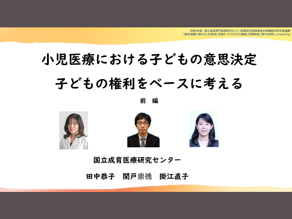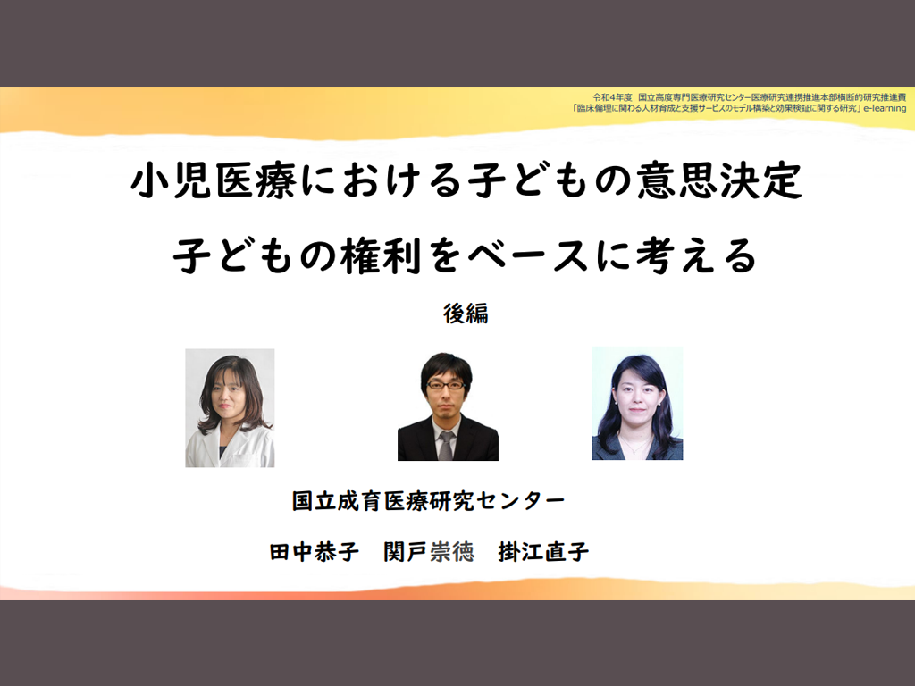 小児医療における子どもの同意をどのように考え、その手続きはどうあるべきでしょうか。子どもの権利条約には、子どもに関することはすべて子どもにわかりやすく説明を行い子どもの意見を聴き、その意見が発達段階に応じて組み入れられることが記されています。そしてこのプロセスは倫理的に重要なポイントであると同時に、メディカルトラウマを予防するためのトラウマインフォームドアプローチでもあります。本章では子どもの権利という視点をベースに、子どもの意志決定に関して概説していきます。(後編)  本コンテンツに関するお問い合わせは、NC・JIHS共通教育講座中央事務局(6nc-educ.jimu@jh.ncgm.go.jp)までご連絡ください。