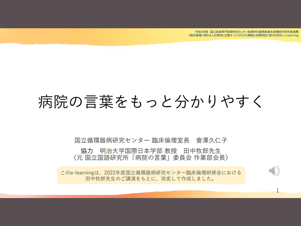 高度専門化する医療において分かりやすい説明と患者の理解は不可欠です。本研修では「『病院の言葉』を分かりやすくする提案」(国立国語研究所、2009)の調査結果と分かりやすくする工夫を紹介します。これを活用してより分かりやすい説明を目指しましょう。 本コンテンツに関するお問い合わせは、NC・JIHS共通教育講座中央事務局(6nc-educ.jimu@jh.ncgm.go.jp)までご連絡ください。