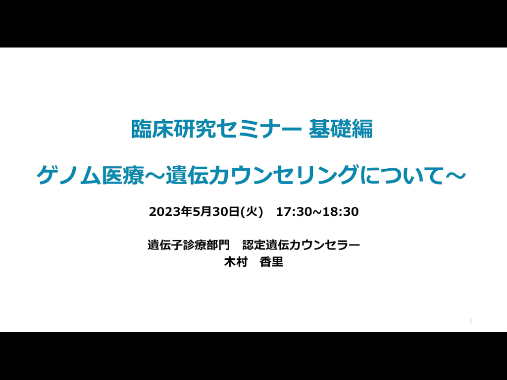 遺伝カウンセラーとして、患者さんやご家族の不安や悩みに寄り添ってきた経験を踏まえ、遺伝カウンセリングとは何か、ゲノム医療について遺伝カウンセリングがなぜ必要なのかを解説しています。2023年5月30日に行われました国立がん研究センターの臨床研究関連セミナーを収録したものです。本コンテンツに関するお問い合わせは、6NC共通教育講座中央事務局(6nc-educ.jimu@jh.ncgm.go.jp)までご連絡ください。