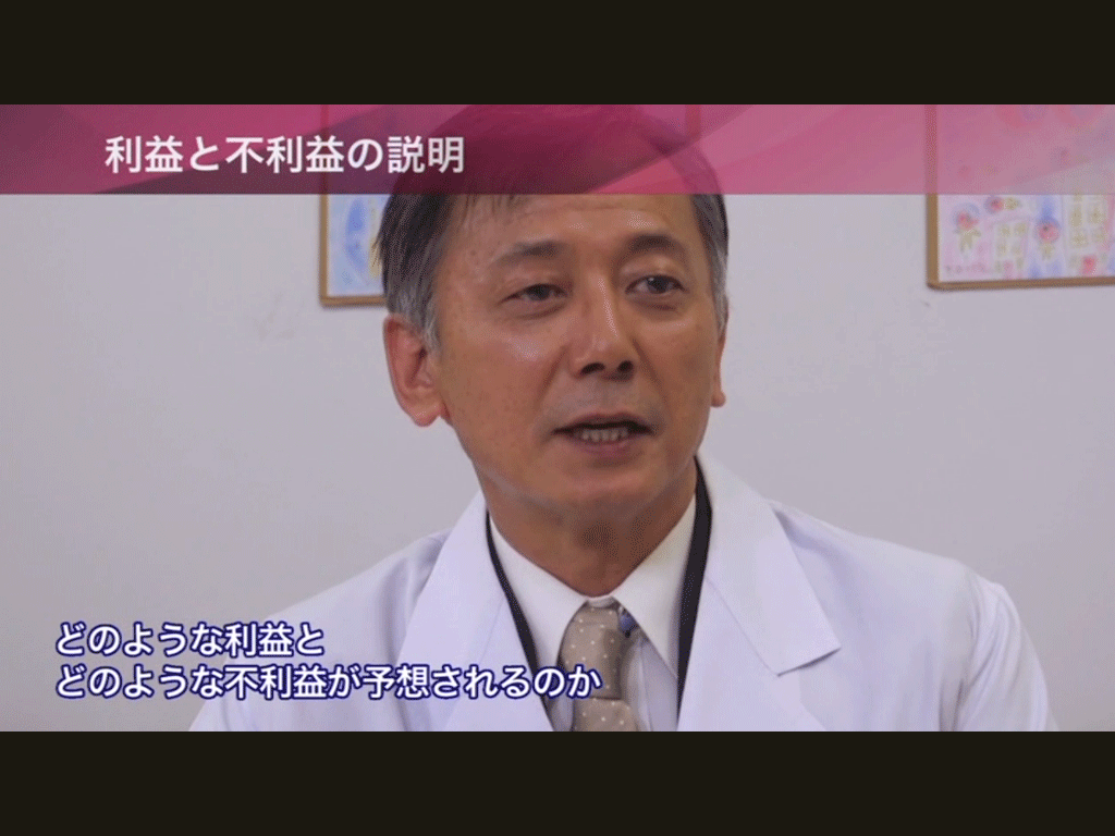 インフォームド・コンセントの基本的な要素と注意点について、自己間葉系細胞を使った第I相試験を例に説明しています。A,B二つのタイプのインフォームド・コンセントの様子を見ていきます。話しやすい環境や状況であるか、会話を通して信頼関係を築くことが出来ているか、そのような点に注目してください。最後に課題が用意されていますので、じっくり考えてみてください。また、PDF資料p.22~25に、課題を議論するための手がかりが記載されていますので、参考にしてみてください。
